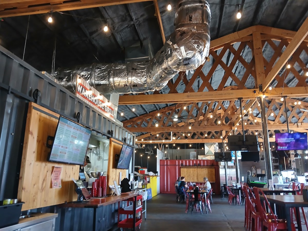 This place is a multitude of small restaurants with some that are built into modified shipping containers, which include a full bar, pasta delight, Drink station, pizza and the warehouse grill with salad bar! Plenty of room to relax and enjoy some delicious food and conversation. Friendly service and welcoming. The entrance is on the EAST side of the building. All businesses are reasonably priced as well. Give them all a try and support local business!!